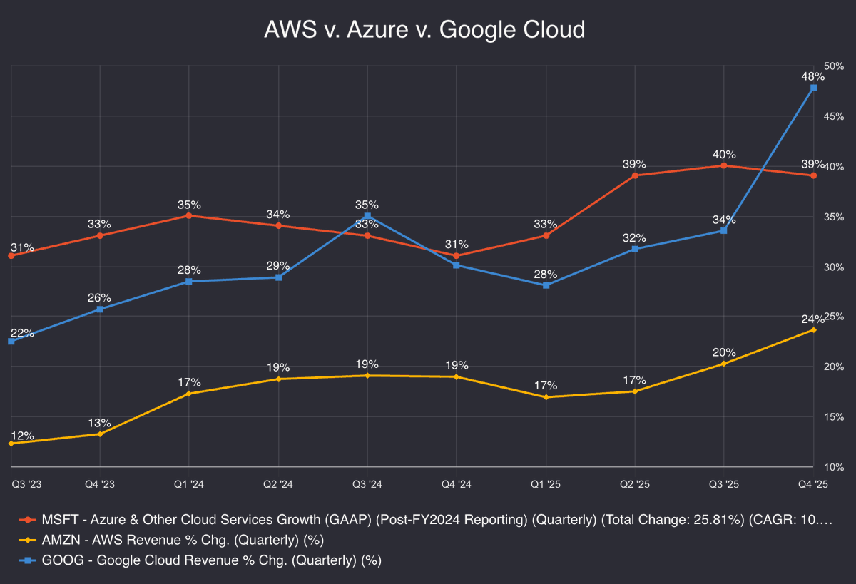 We saw AWS growth accelerate every quarter last year, reaching 24% YoY in the last quarter. This growth was because of Anthropic’s giga-watt scale clusters coming online late in the year.