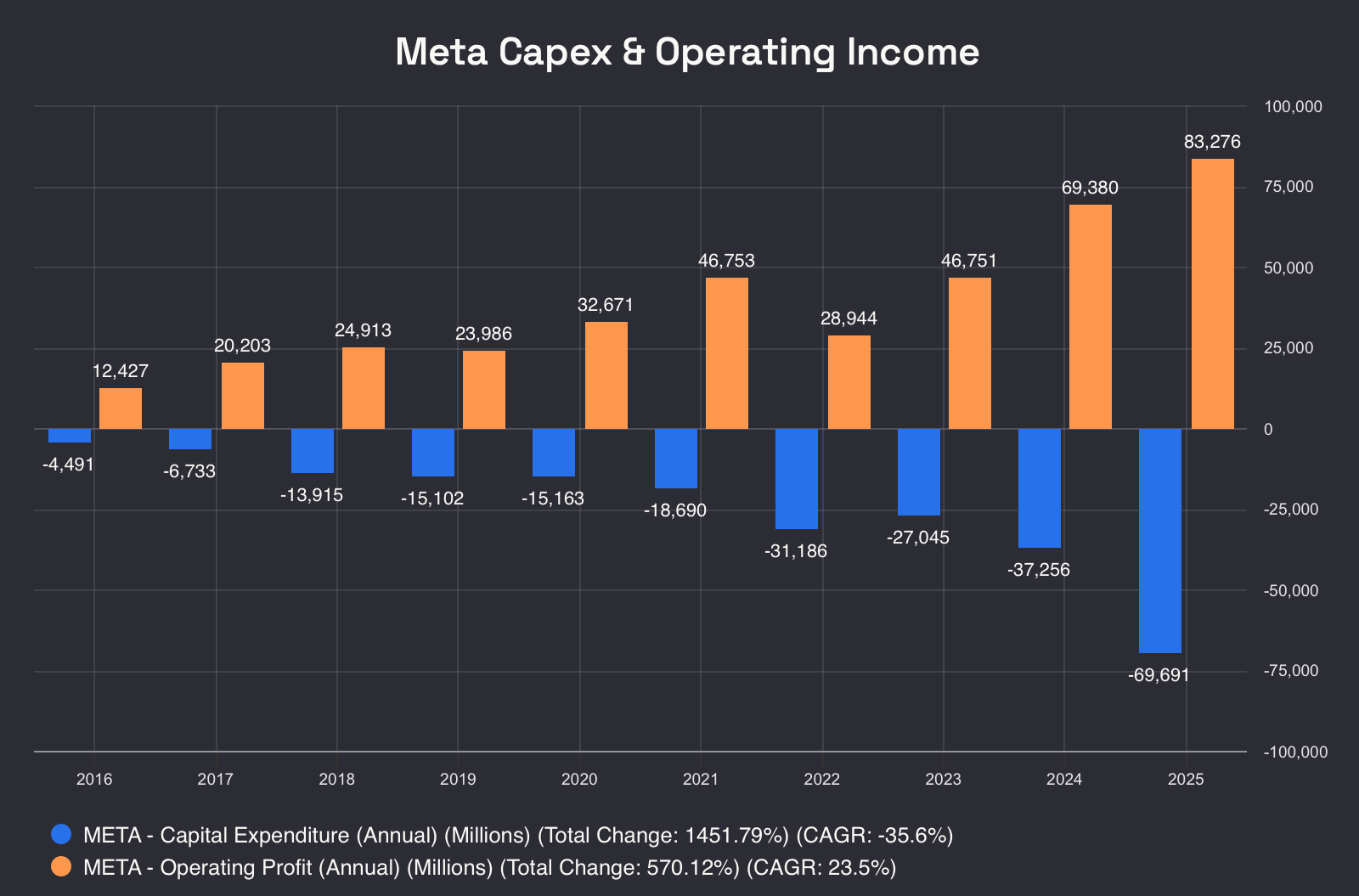The real question for me is whether they’ll destroy shareholder value while pursuing other AI-related opportunities, as we experienced this with Metaverse. They spent around $70 billion in capex last year and are guiding for $115-$135 billion this year.