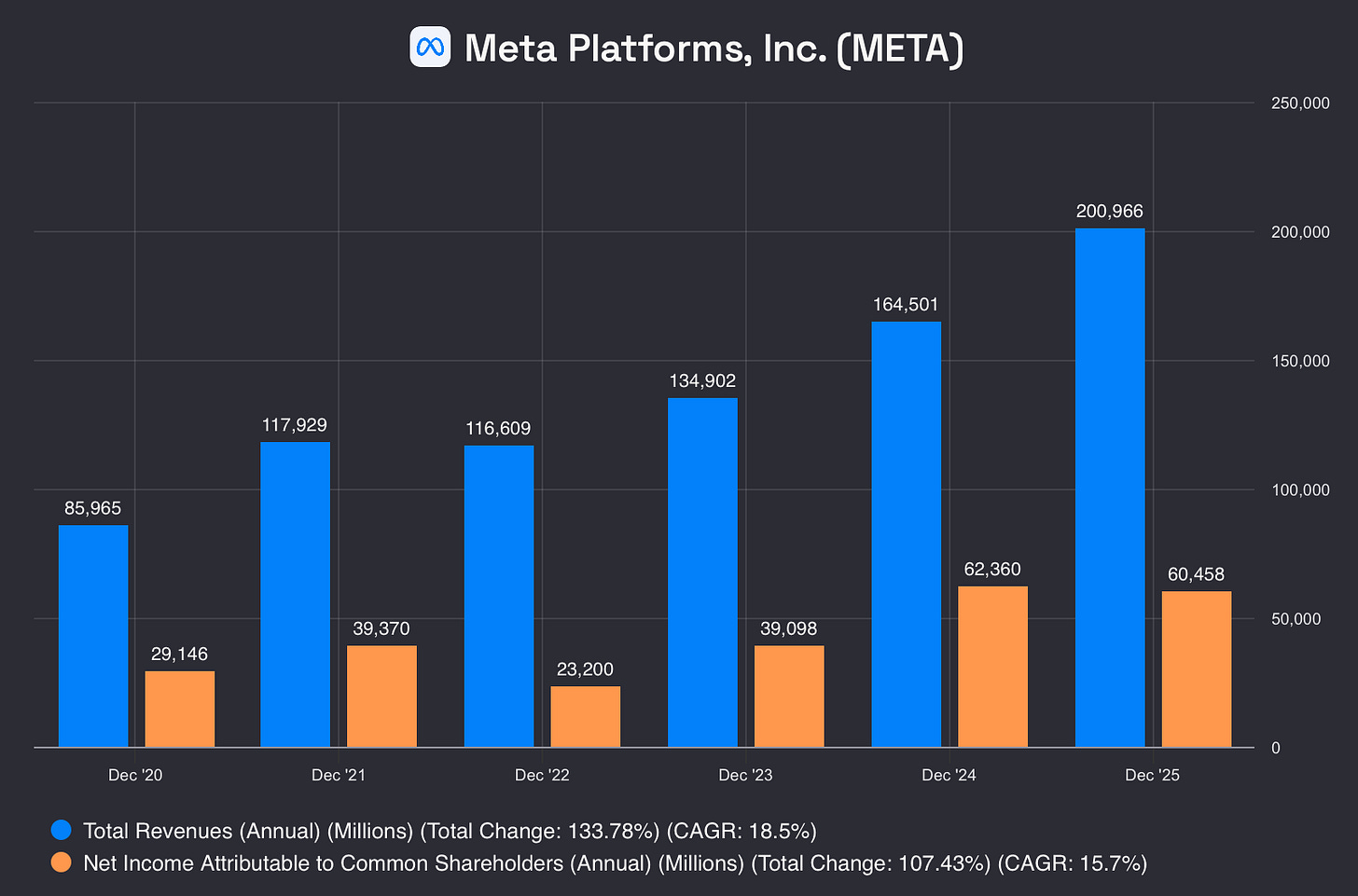 What’s remarkable for Meta is that its growth accelerated every year in the past three years despite its gargantuan size. It grew 16% in 2024, 22% in 2024, and 22.2% last year.