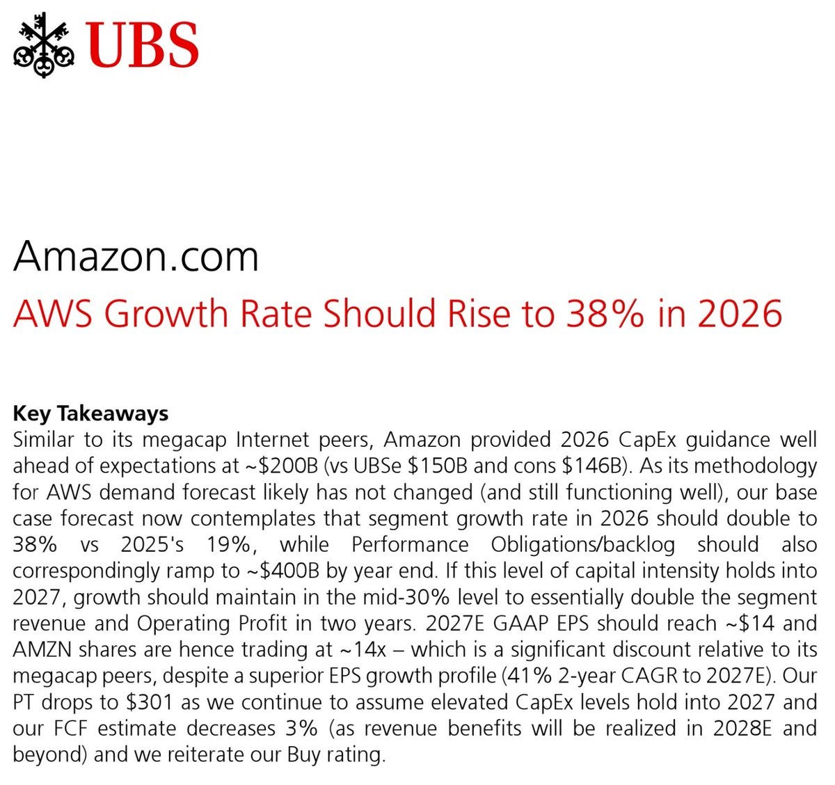 Thus, I expect AWS acceleration to continue throughout this year. UBS also stated that AWS's growth may come at 38% this year: