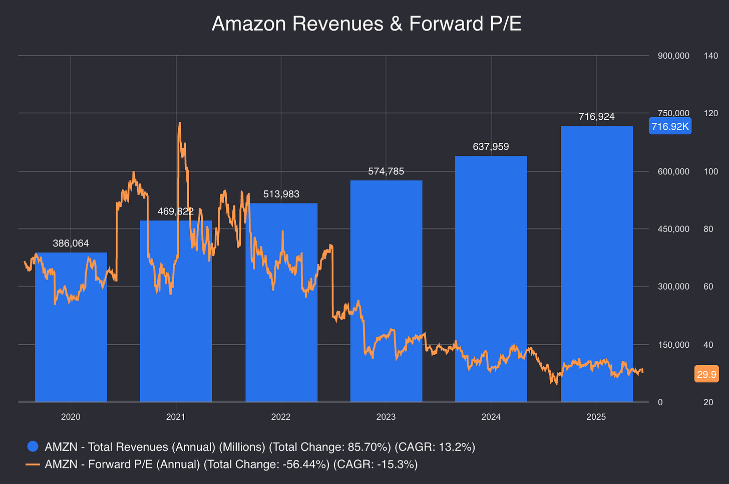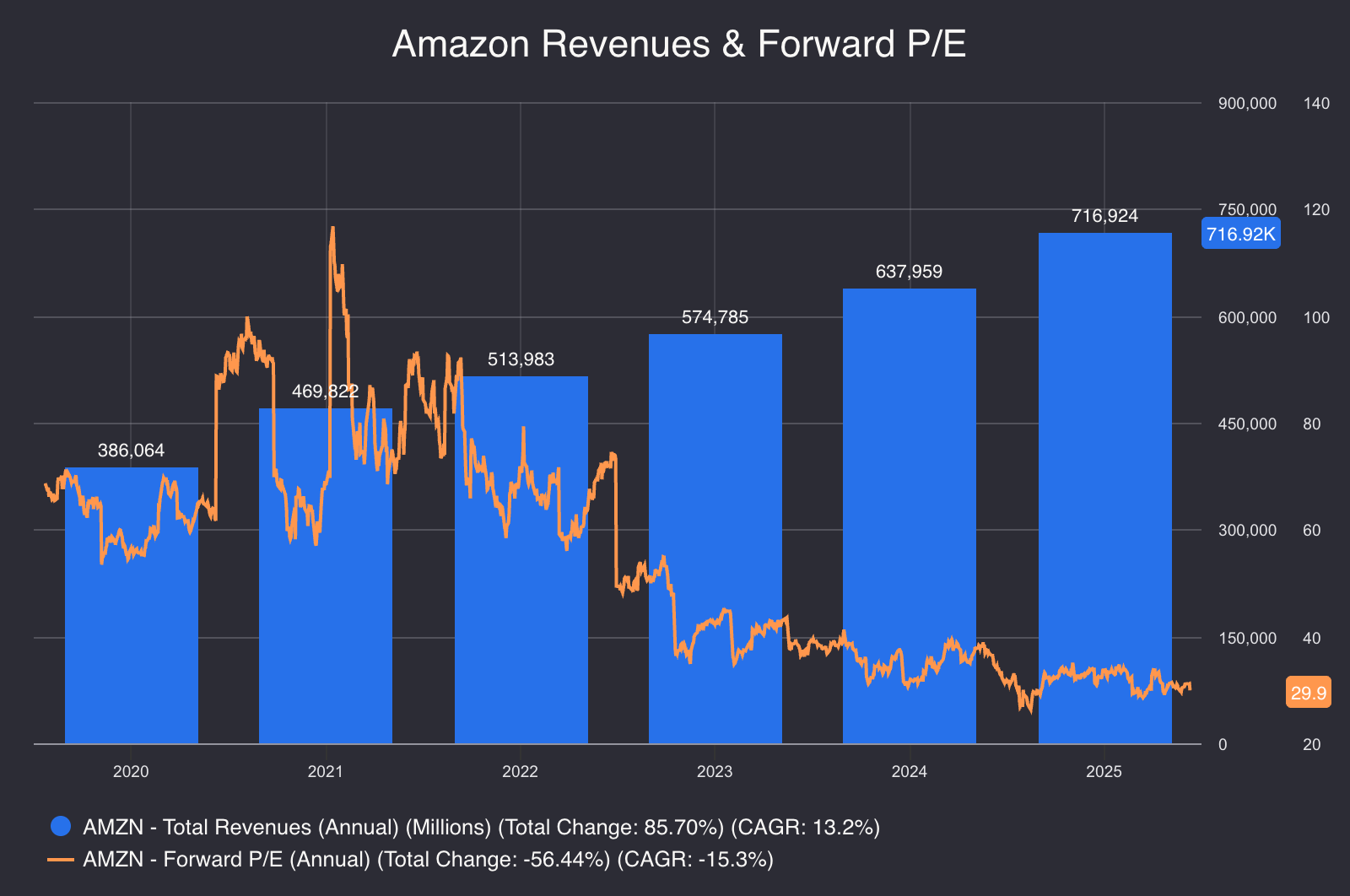 In the last couple of years, the biggest drag on Amazon’s valuation was cloud growth lagging behind the competitors. While Google Cloud was growing by +25% a year and Azure by +30% a year, AWS was lagging with growth below 20%.