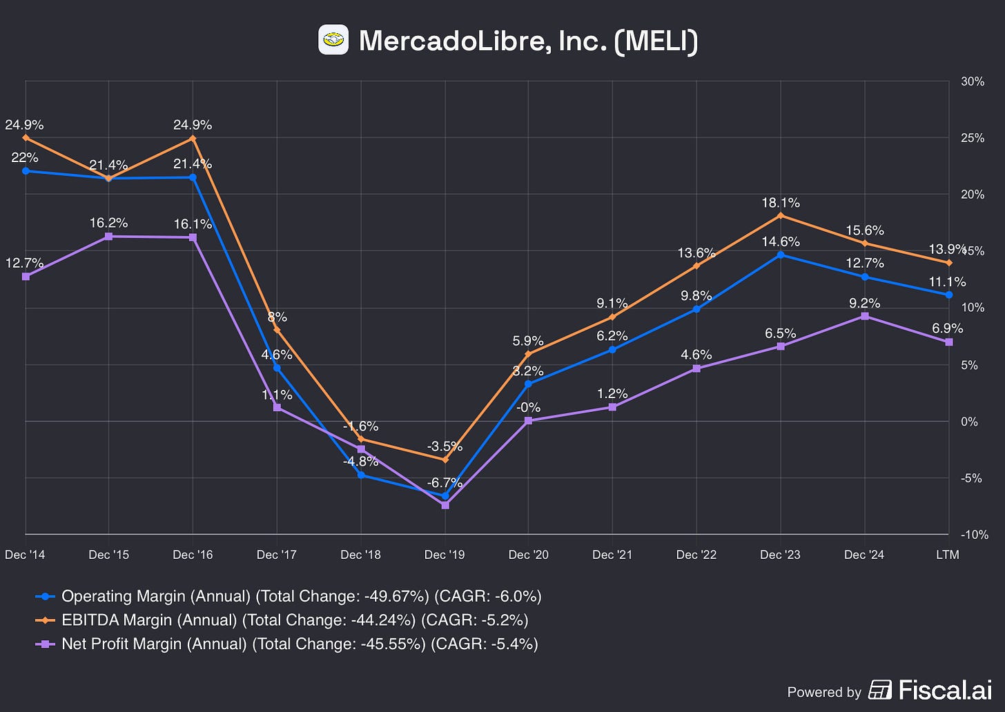 Amazon finished last year with nearly 11% net margin. Given that the tech side of their business (cloud) is much more capital-intensive, I think Meli’s blend margins will be much higher than Amazon’s, possibly hitting 15% mark with ease, as it was already close to 10% in 2024.