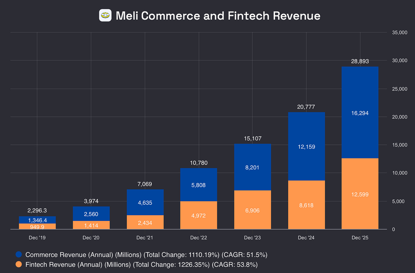 Both of these segments are still growing very fast, as fintech grew 53.8% and commerce grew 51.5% annually since 2020: