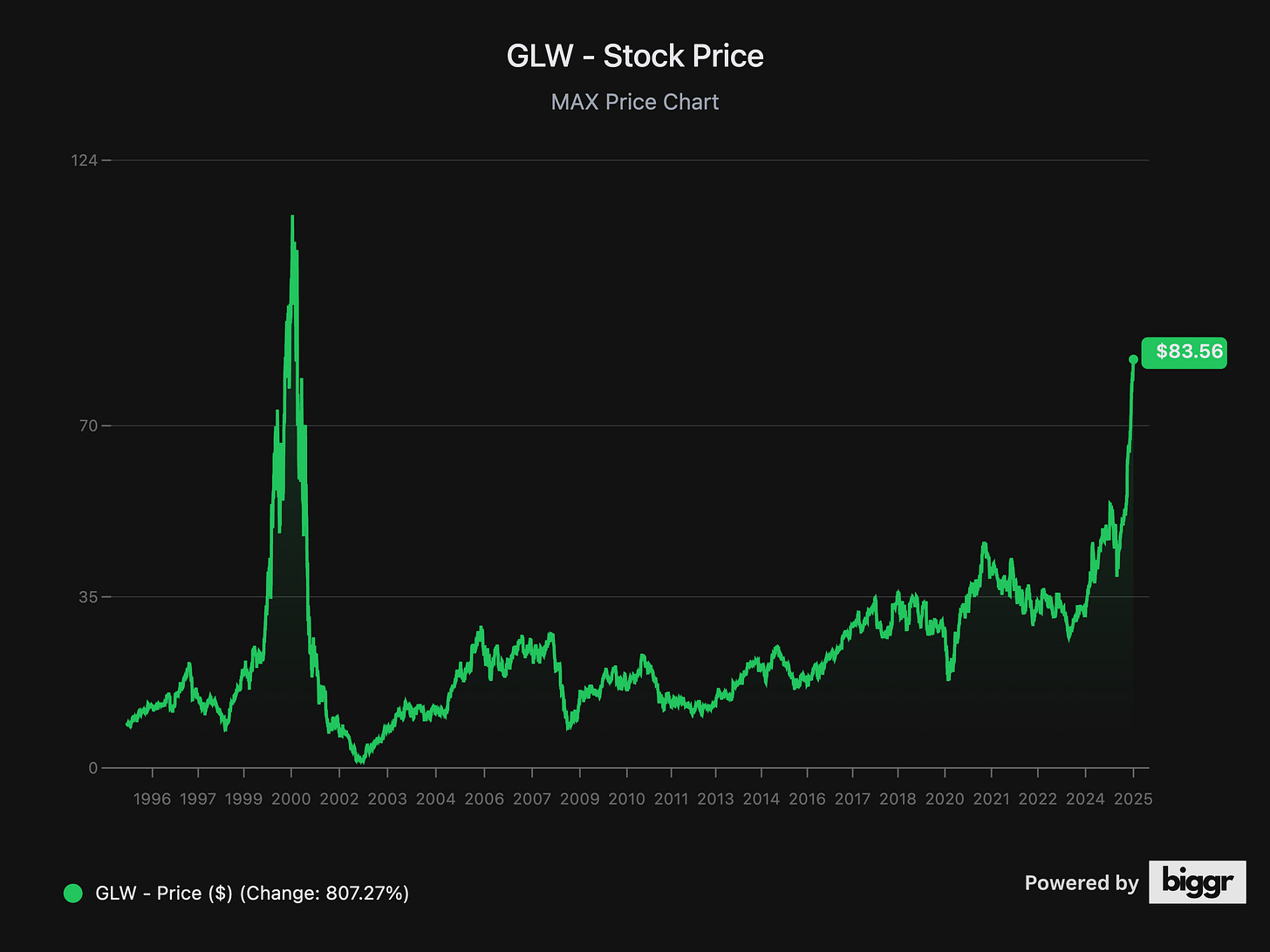 Corning was the leading supplier of those cables, and its revenues and thus the stock price followed a very similar pattern to that of Cisco: