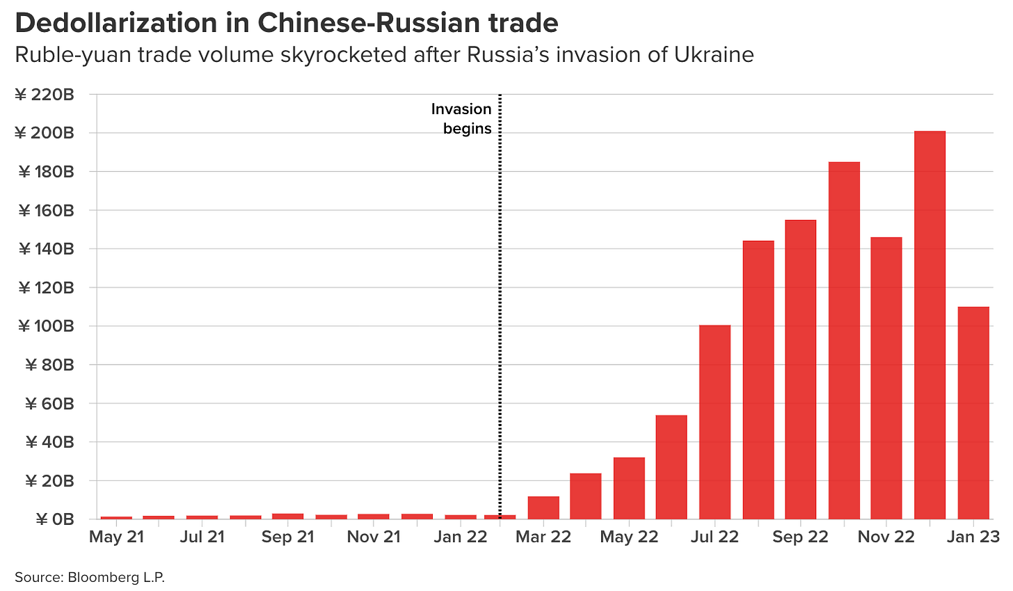 Thus, Yuan quickly became the dominant trade currency between Russia and China. The trade between the two countries was now de-dollarized.
