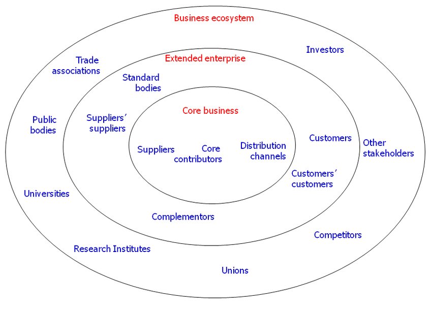 His ecosystem definition was genius as it didn’t include just interconnected businesses, but also other actors such as suppliers and even competitors. His business ecosystem looks as follows: