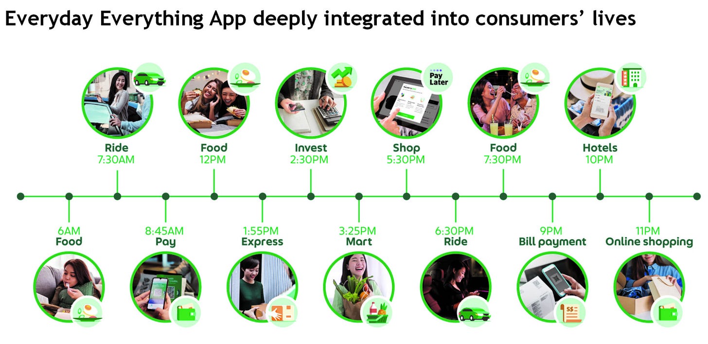 The superapp flywheel is real — high-frequency daily needs (ride/food/grocery) + embedded fintech = massive digital moat in SEA.