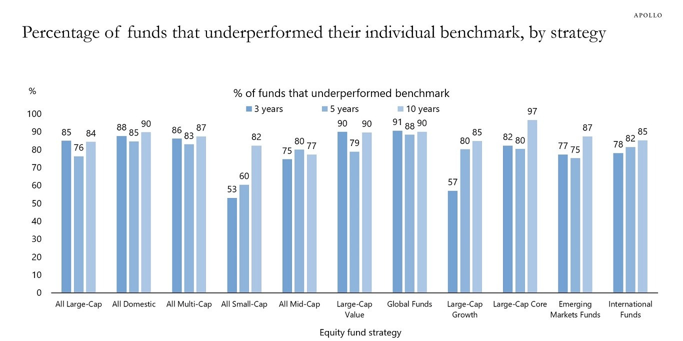 85% of active large-cap managers underperform their benchmark in both the short and long term. What’s even worse is that 85% of all managers across all strategies underperform their benchmark in the short, medium, and long term.