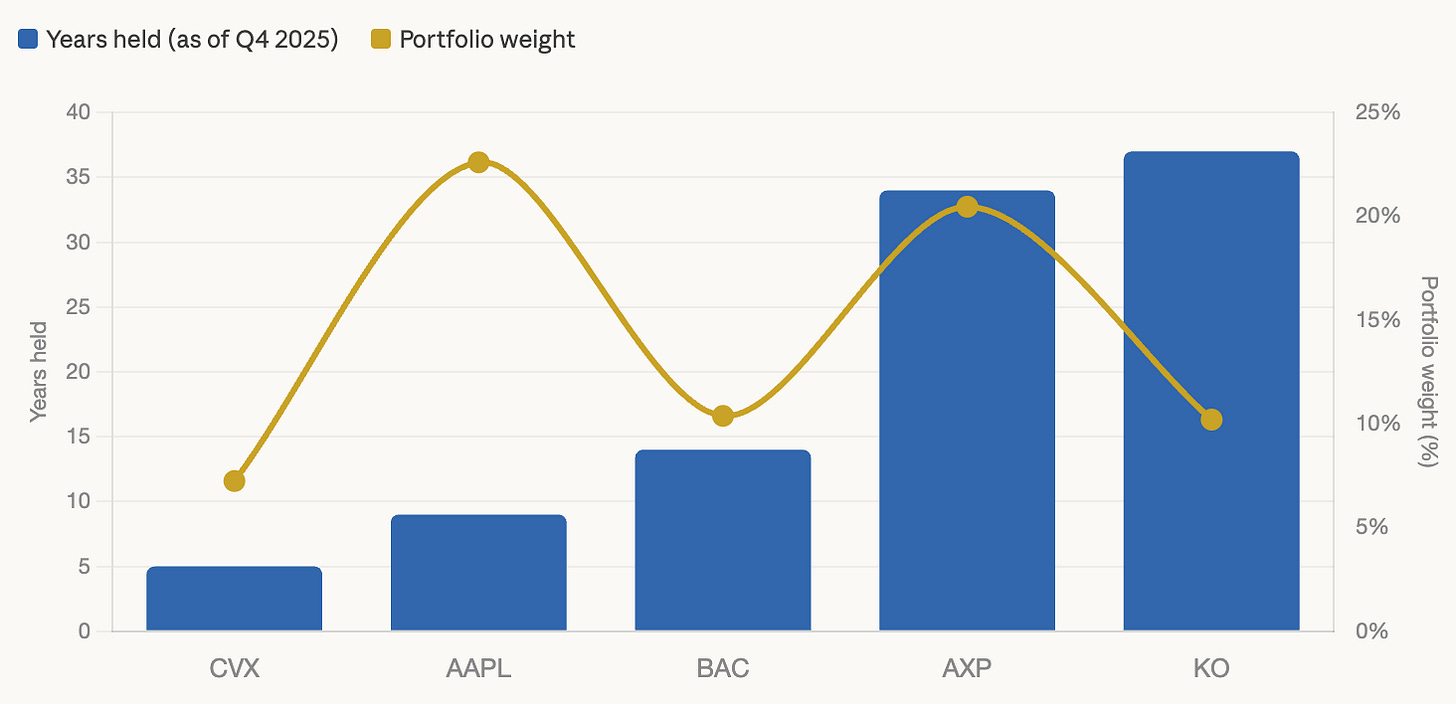 As a result, he naturally starts with a longer initial holding period, which is prolonged if his thesis on durability and competition stands. His current average holding period for the top 5 positions that make up 70% of the portfolio is 20 years: