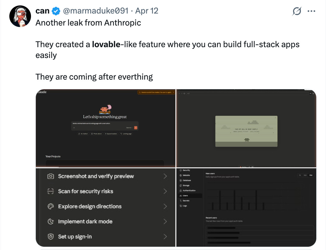Anthropic is developing a Lovable-like vibe-coding feature. That’s the most natural thing in the world, as Lovable also runs Claude under the hood. They’ll come for all those AI software that are basically wrappers of their foundational models. The only thing that limits them is compute.