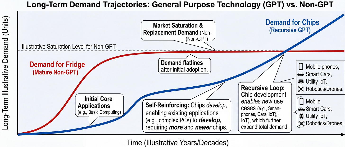 As a result, the long-term demand curve of GPTs looks way different than other technologies. While other technologies flatline in demand, GPTs keep rising since their use cases expand as they develop, spurring innovations and developments in the existing ones.