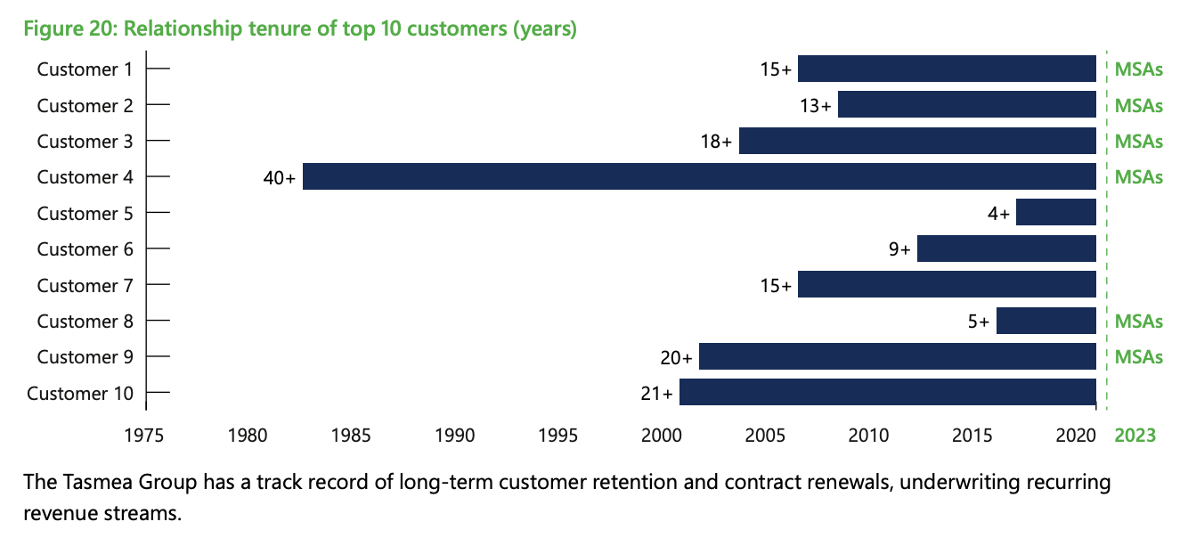 As a result, most of its customers stick with it for a very long-time, allowing it to grow by both adding new business and raising prices year-over-year for the existing customers. For reference, its 10 biggest customers had an average tenure of 16 years as of 2023; now it should be longer as they haven’t lost any major clients.