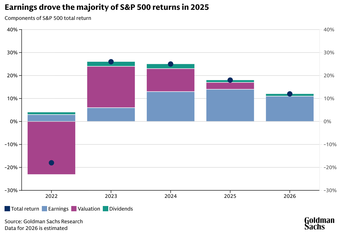 Goldman Sachs expects that this year will be the same. They think the S&P 500 will appreciate by 12% this year and all the returns will come from earnings growth and dividends: