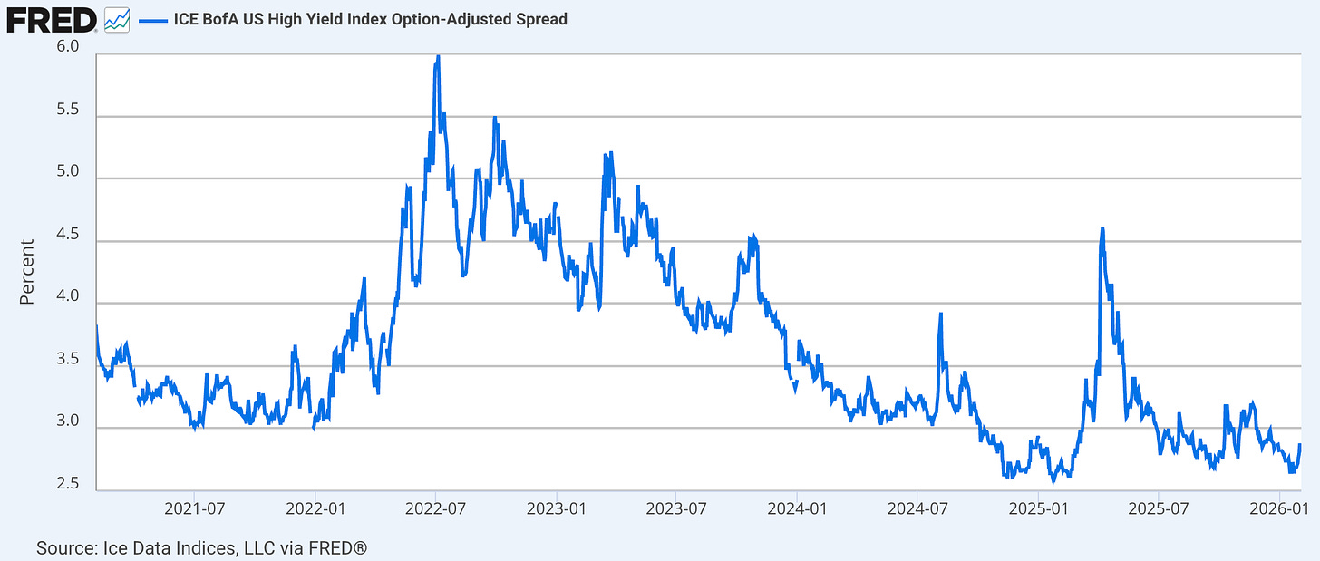 This means that we have been pretty generous with lending money, asking a very small premium from riskier borrowers. Except for a brief spike that followed the tariff announcements last April, credit spread has been below 3% since January last year.