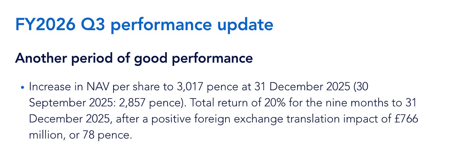 Last week, 3i filed its latest update, and they said the NAV was 3,017 pence per share: