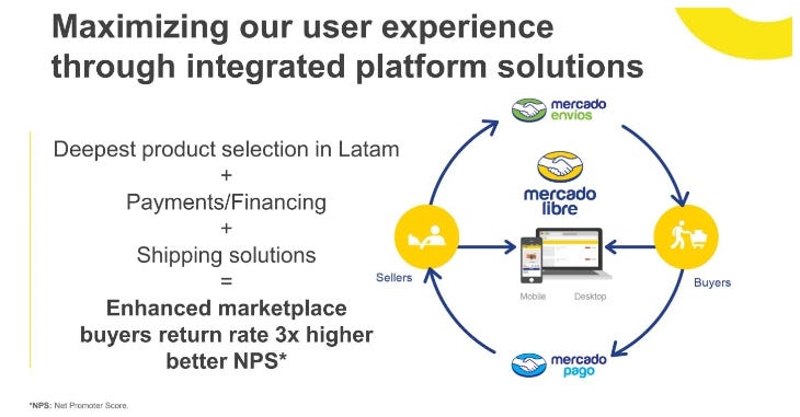 Amazon did this with third-party seller services and advertising. MercadoLibre is doing it with logistics and fintech, MercadoPago. It’s providing comprehensive financial services to both buyers and sellers on the platform.