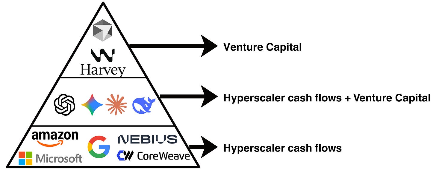As the market structure is guaranteed to be oligopolistic and entry barriers are high, risk capital that needs to be fragmented to work stays largely out of this layer. Thus, this layer is funded almost fully by hyperscaler cash flows. Even neo-clouds themselves are dependent on hyperscalers. This further reinforces the oligopolistic market structure.