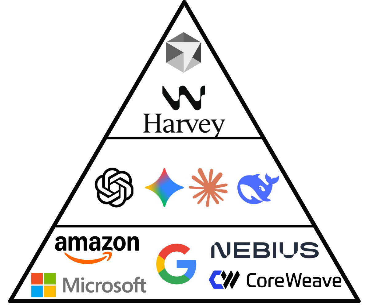 Think of it like a pyramid. At the top of the pyramid, there are wrappers, below them are the foundational models, and infrastructure players are at the bottom.