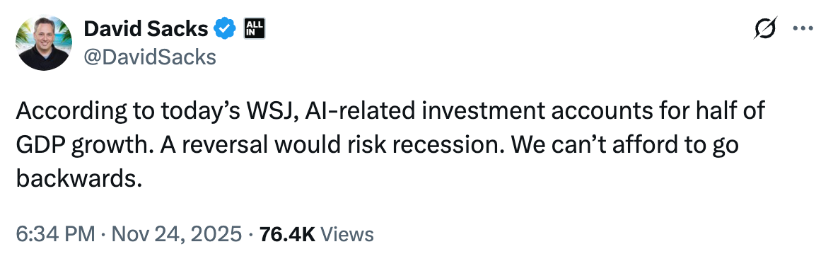 Firms still investing massive amounts despite the inevitability of a bubble isn’t surprising to me. We understand why they can’t stop. What’s interesting to me is that people are still investing in AI stocks at high valuations despite the main market actors accepting the high possibility of a bubble.
