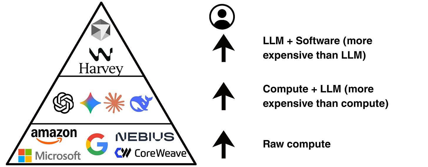 The critical consequence of the high capital requirement in the first two layers is that the broader risk capital is pushed toward the top of the pyramid, where the capital requirement is pretty low, as it’s software+API calls to foundational models.