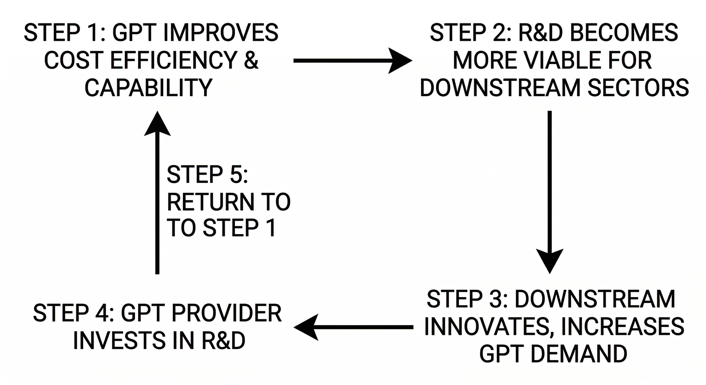 Step 4: The increased demand and the expanding set of application sectors make it more profitable for the GPT provider to invest in further R&D.