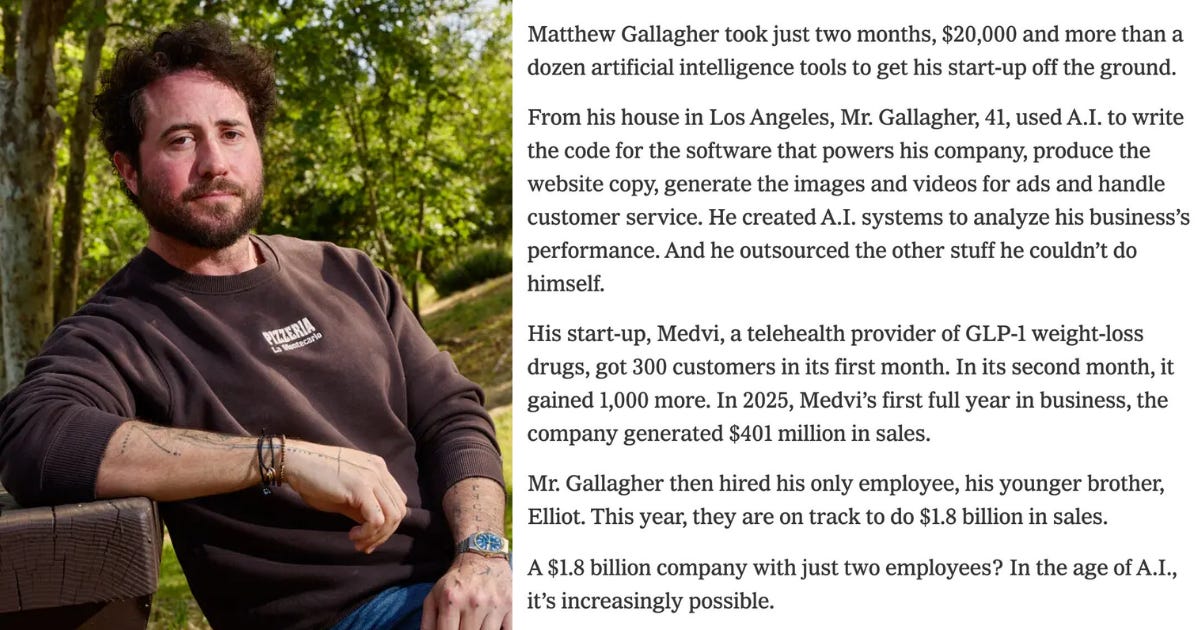 Another example is Matthew Gallagher, who basically created the first one-person billion-dollar company. He literally vibe-coded an entire telehealth company, used AI to create image and video ads, and sold through Facebook ads.