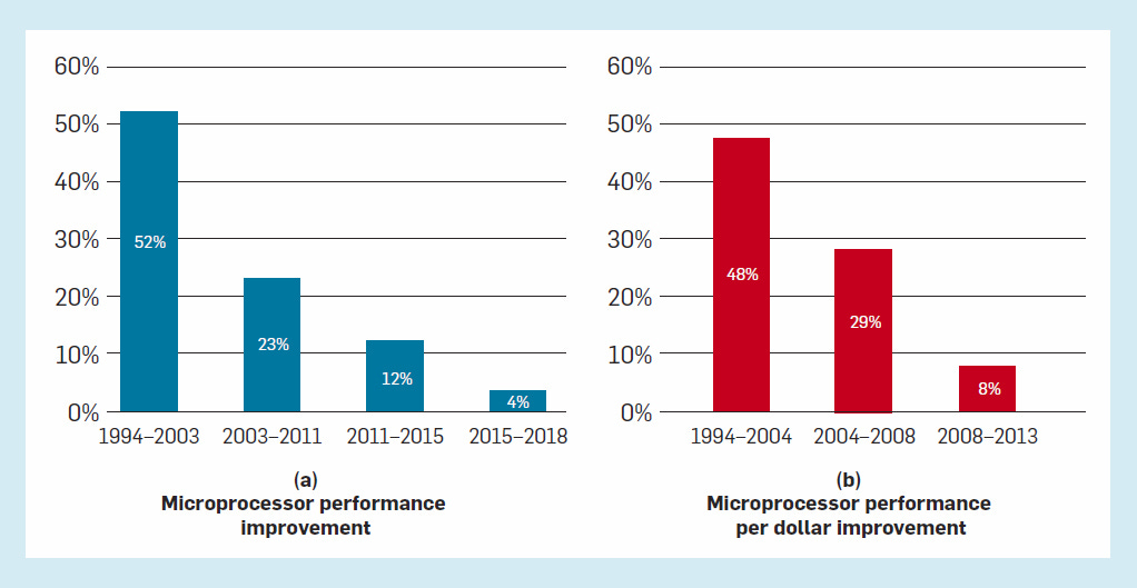 This is essentially true, as the very reason they are faster can scale better is that it’s become cheaper and cheaper to produce transistors at smaller sizes, so we can pack more of them in a chip, which delivers better performance at a lower price. This is a direct result of widespread innovation efforts on transistors, as the writers suggest.