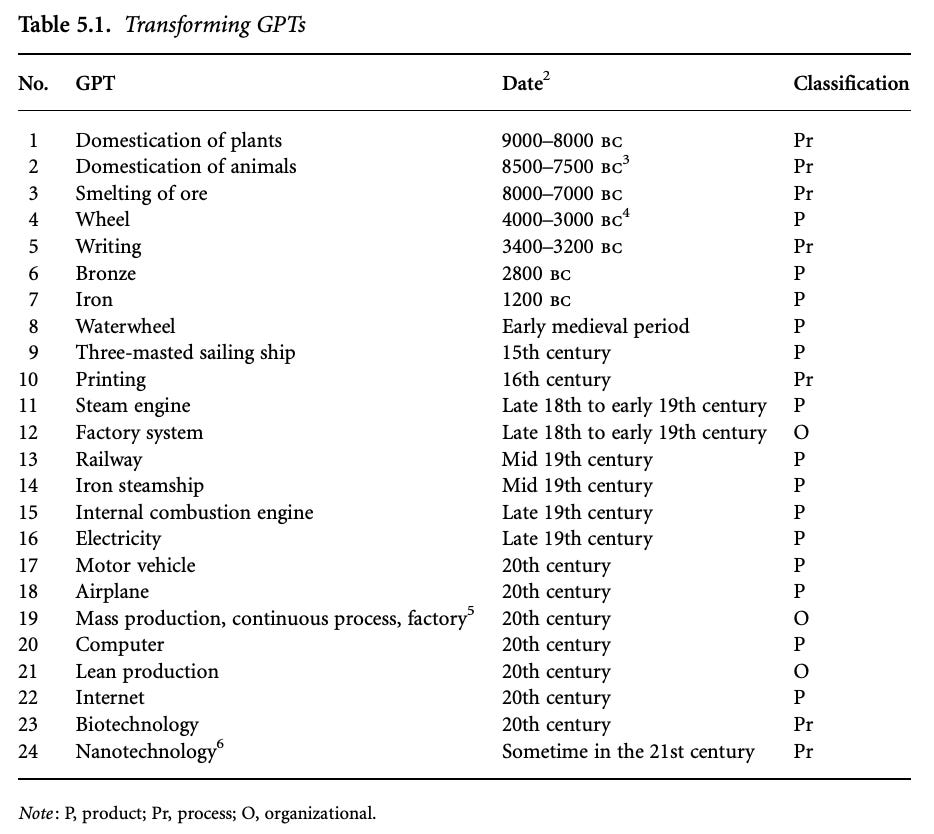 It was only in 2005 that a broader attempt to list GPTs came. Richard G. Lipsey, Kenneth I. Carlaw, and Clifford T. Bekar listed 25 GPTs in their 2005 book, Economic Transformations: General Purpose Technologies and Long-Term Economic Growth.