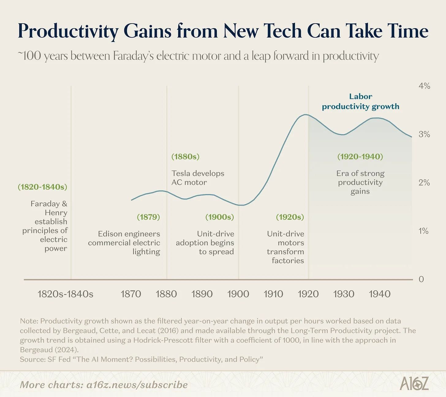 Thus, when people look at the immediate impact of AI and don’t see any material contribution to growth and reach the conclusion that AI may be a bubble, or we may be overbuilding, they are completely ignoring the very long period of capability expansion for new GPTs and innovation spillovers.
