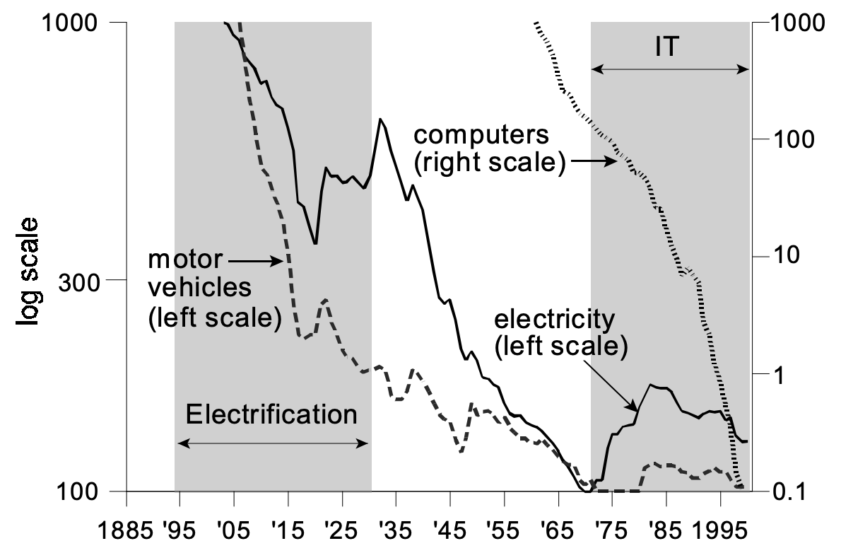 “continuous innovational efforts about GPTs, as well as learning, increase over time the efficiency with which a GPT performs its generic function. This may show up as reductions in the price/performance ratio of the products, systems, or components in which the GPT is embodied, or as multidimensional qualitative improvements in them.”