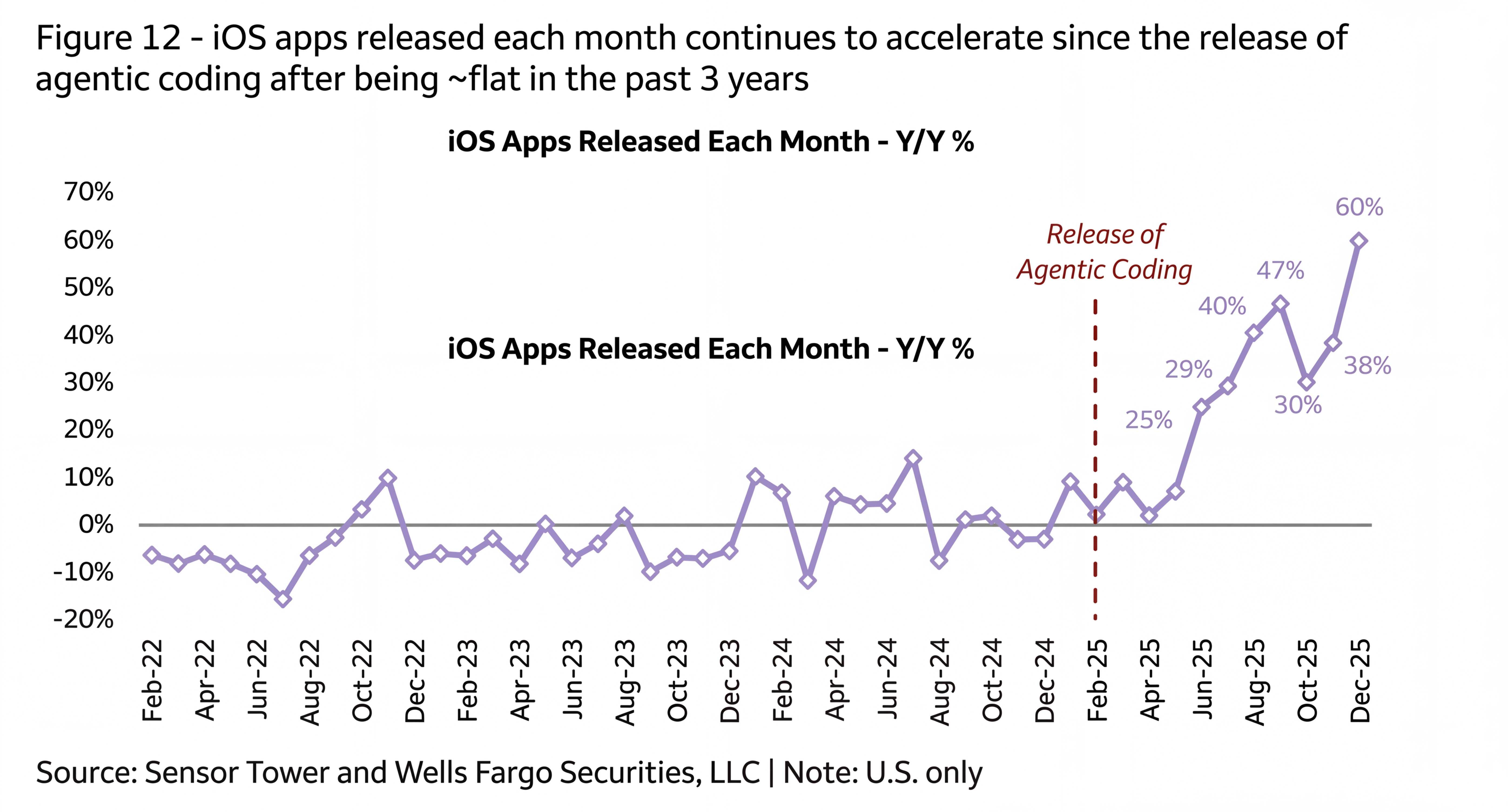 It’s a very big deal that the IOS app releases, which were stable from 2022 to 2025, skyrocketed after Claude Code became mainstream and foundational models became capable enough.