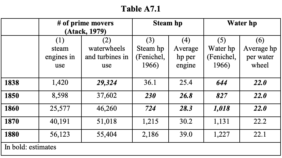 As you see below, the steam hp grew pretty fast between 1838 and 1850. The Corliss engine was commercialized in the early 1950s. Then, from the 1850s to the 1890s, number of steam engines increased by another 8x: