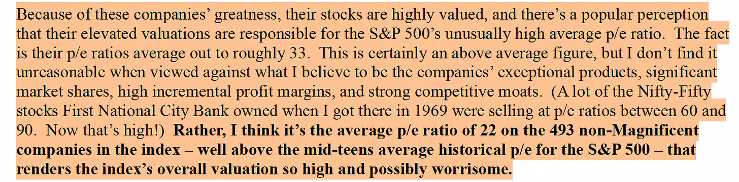 He says 33 times earnings of the Mag7 is probably less problematic than the 22 P/E for the remaining 493 stocks: