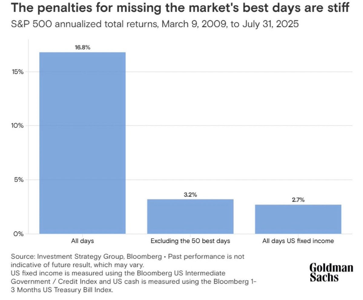 If you missed the 50 best days in the market in the last 16 years, your average annual return would have been 3.2% instead of 16.8%.