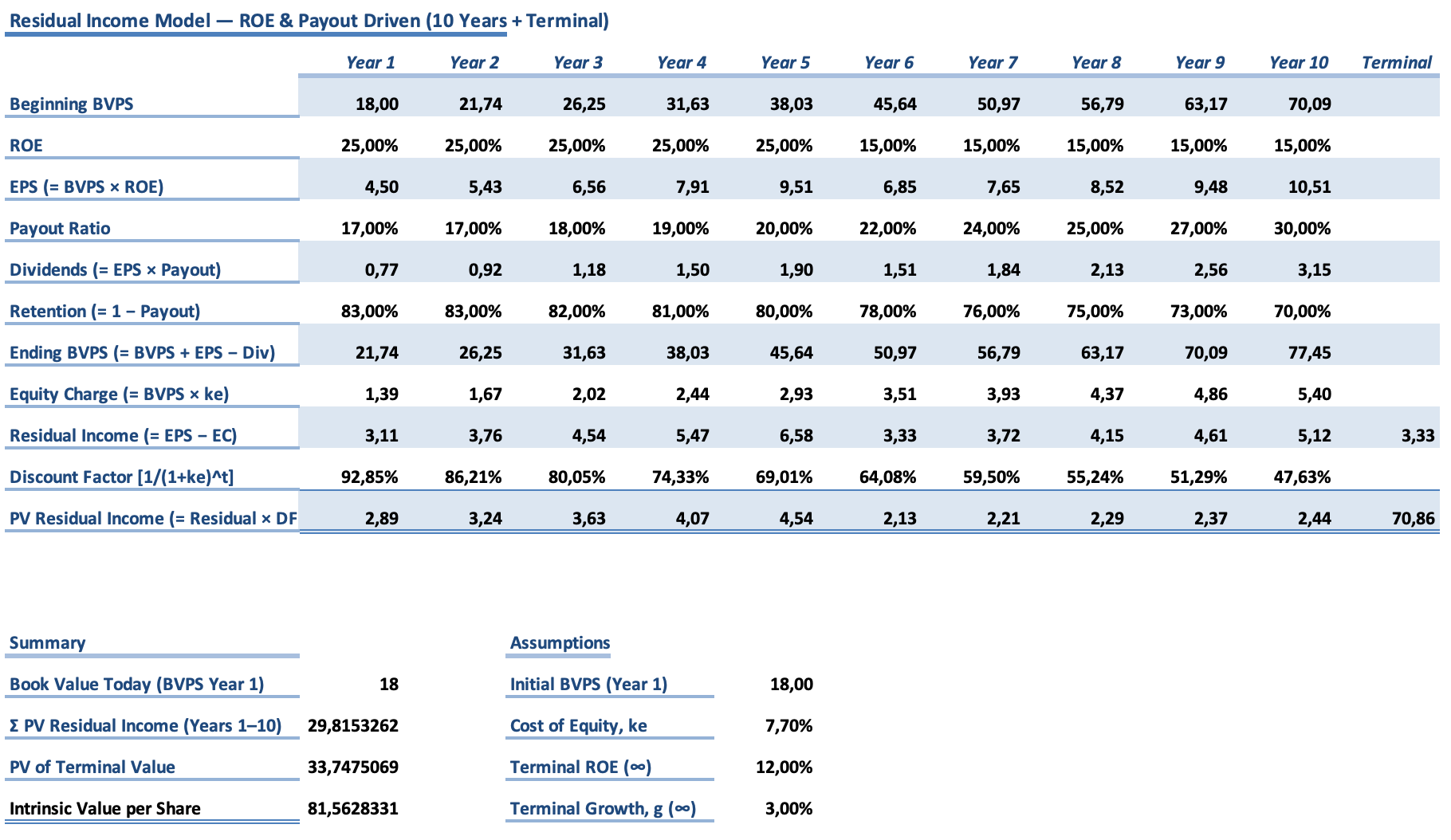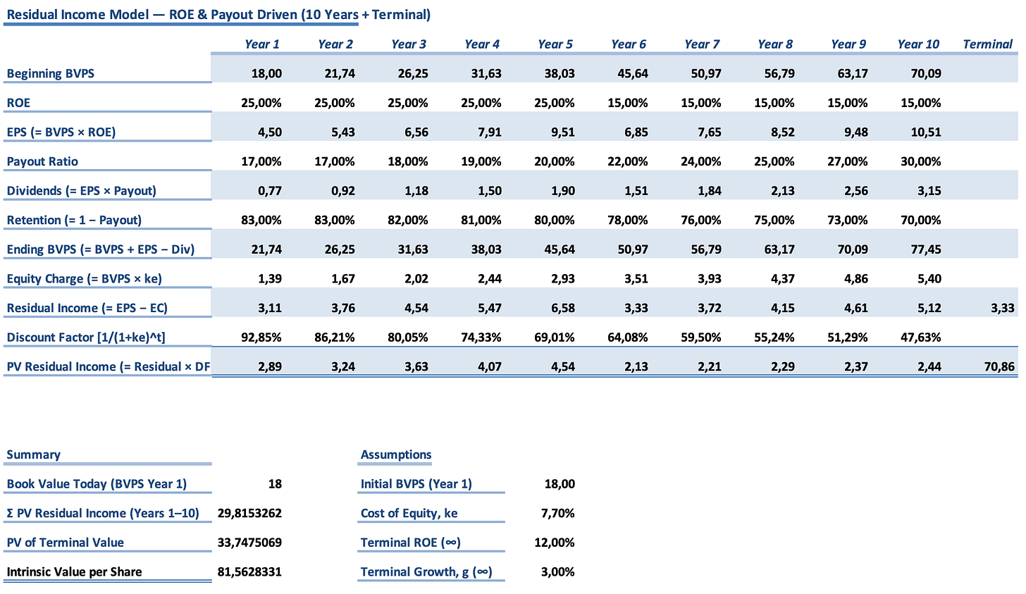 Based on a Residual Income Model (RIM) assuming 25% Return on Equity in the first 5 years and 15% beyond that with just 12% ROE in the terminal period, we get an intrinsic value way above todayâs valuation: