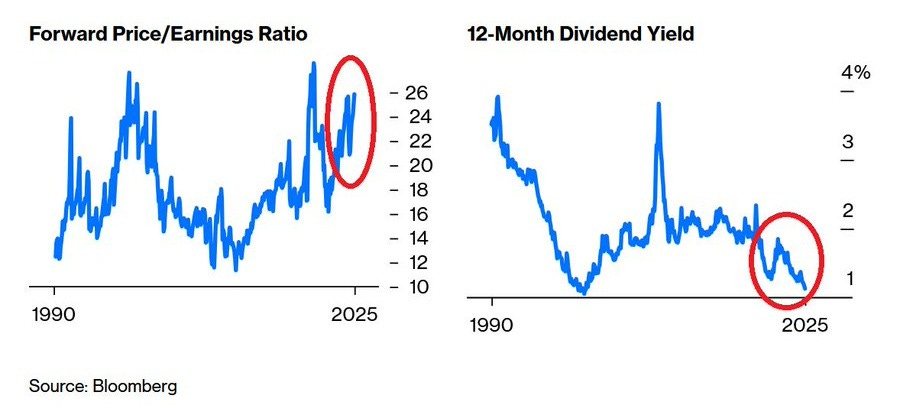 The market is trading at a historically high 23x forward earnings and around 1% dividend yield: