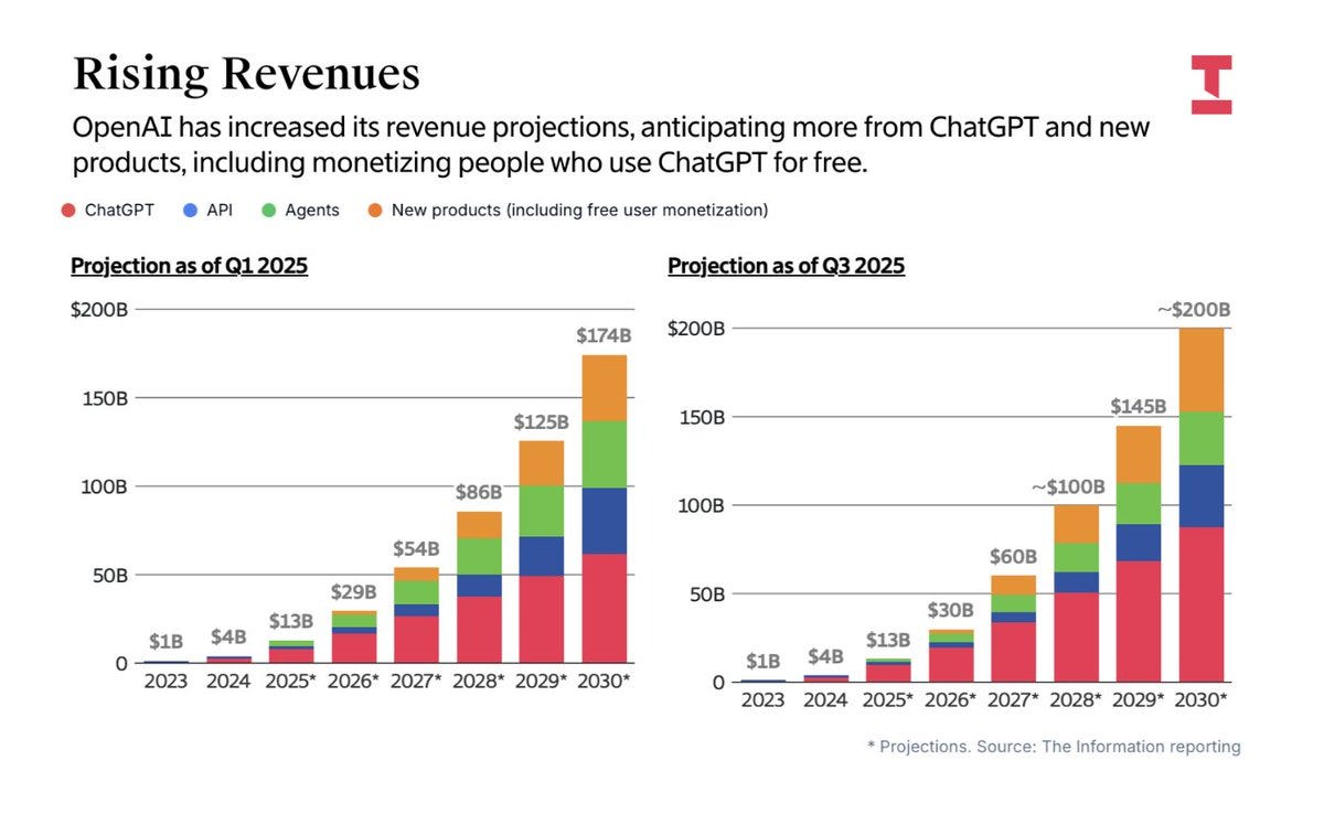 OpenAI is now projecting ~$200 billion in revenue in 2030, up from $13 billion this year:
